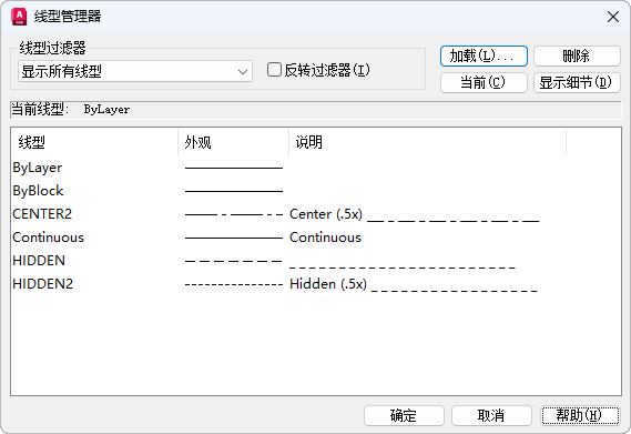 显示已加载的线型名称。要重命名线型,请选择线型,然后两次单击该线型并输入新的名称。不能重命名 BYLAYER、BYBLOCK 、CONTINUOUS 和依赖外部参照的线型。