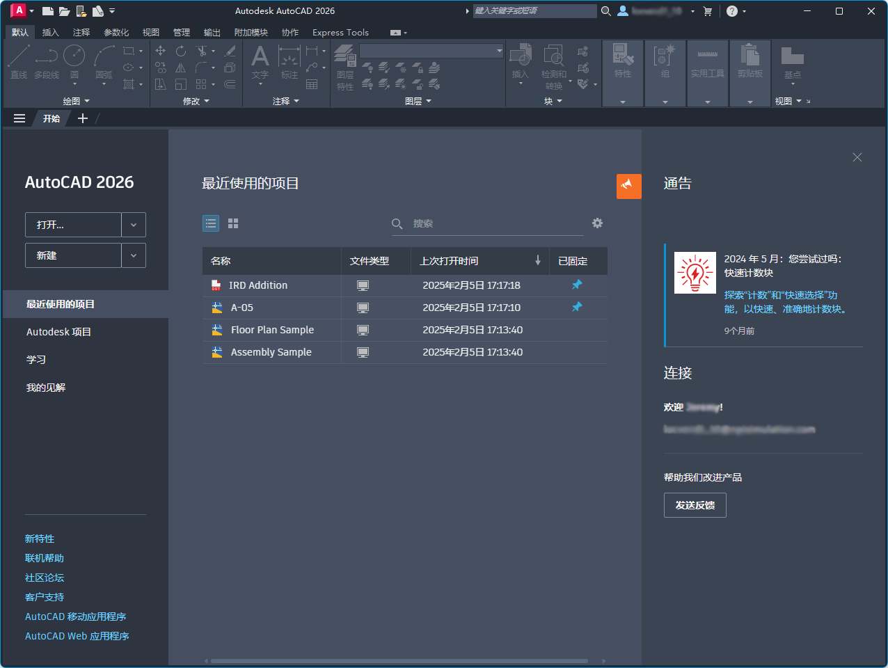 “开始”选项卡默认在启动时显示,让您可以轻松访问各种初始操作,包括访问图形样板文件、最近打开的图形和图纸集、联机和学习选项以及通告。