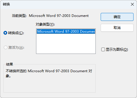 用“对象类型”中选定的类型打开嵌入对象,但在编辑后返回到对象的当前类型。