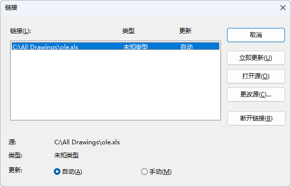 切断对象与原始文件之间的链接。将图形中的对象修改为 WMF(Windows 图元文件格式),即使将来修改了原文件,该格式也不受影响。