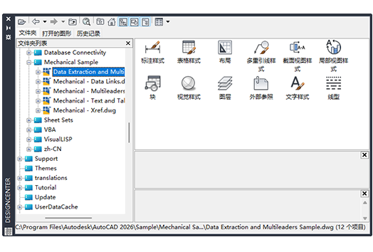 可以使用左侧的树状图浏览内容的源,而在右侧的内容区中显示内容。可以在内容区中将项目添加到图形或工具选项板中。将显示选定的图形、块、填充图案或外部参照的预览或说明。
