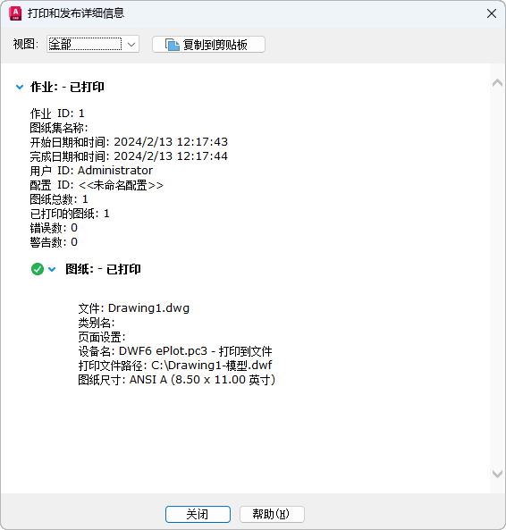 显示关于所有完成的打印和发布作业以及这些作业中的图纸的信息。