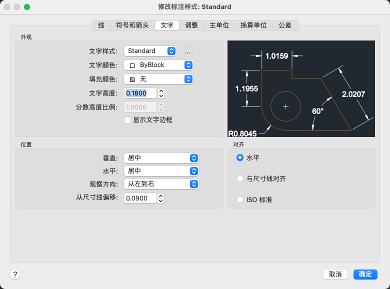 设定当前标注文字样式的高度。在文本框中输入值。如果在“文字样式”中将文字高度设定为固定值(即文字样式高度大于 0),则该高度将替代此处设定的文字高度。如果要使用在“文字”选项卡上设定的高度,请确保“文字样式”中的文字高度设定为 0。(DIMTXT 系统变量)