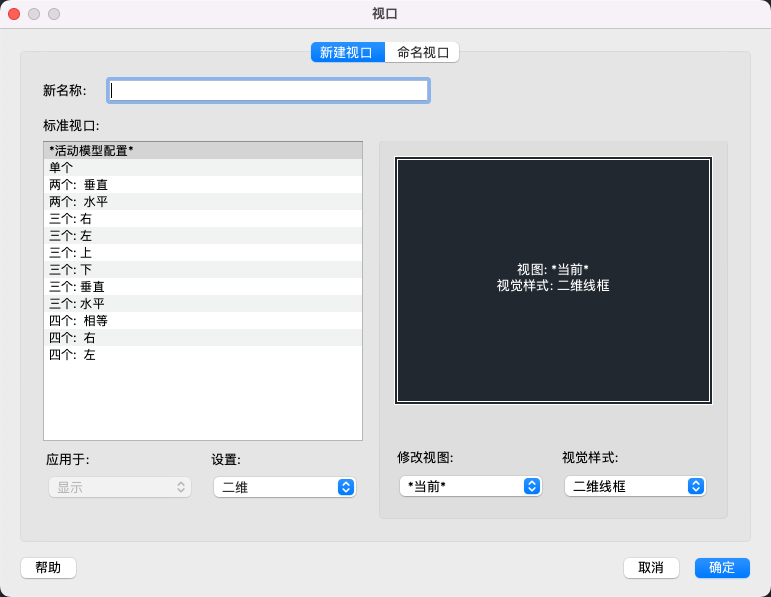 指定二维或三维设置。如果选择二维,新的视口配置将最初通过所有视口中的当前视图来创建。如果选择三维,一组标准正交三维视图将被应用到配置中的视口。
