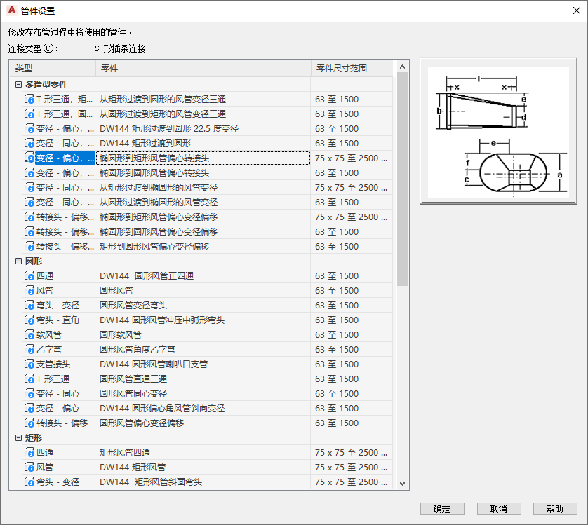 “管件设置”工作表显示了当前的连接类型,并列出可用的类型和零件。