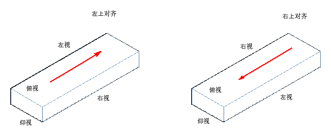 以下示例对风管对象的“左上”对齐和“右上”对齐进行了对比。请注意,绘制方向(如箭头所示)确定了对齐在图形中的表示方式。