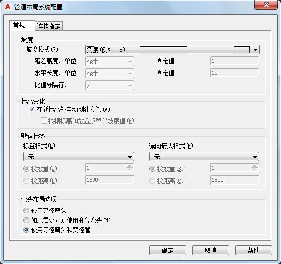 “管道布局系统配置”对话框中的“常规”选项卡控制坡度、标高、标签和流向箭头的管道布局系统配置。