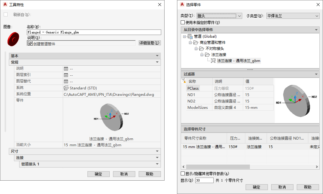 提示: 选择“使用未指定的零件”类型,以禁止在此对话框中选择零件。选择此选项后,将在工具选项板上创建一个不包括指定特性的工具。在布局管道管路时,可以使用此新工具启动对象的“添加管件”命令。
