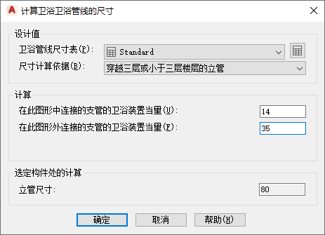 如果该尺寸是根据立管计算所得,“计算卫浴管线的尺寸”对话框显示的是图形中立管的尺寸结果。