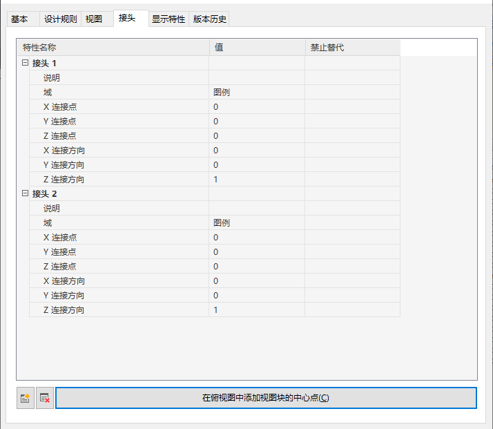 脚本中的“接头放置”特性不显示在该选项卡上。在“样式管理器”中,仅可以使用如图所示的选项,通过输入 X、Y 和 Z 坐标指定接头位置,或者通过将接头放置在块的中心进行指定。
