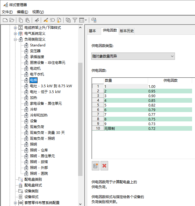 软件为每个供电因数指定一个值,该值乘以负荷可确定某个负荷类别的供电负荷。定义供电负荷是很重要的,有助于避免回路超负荷。通过定义供电因数,还可以实际计算估计供电负荷。