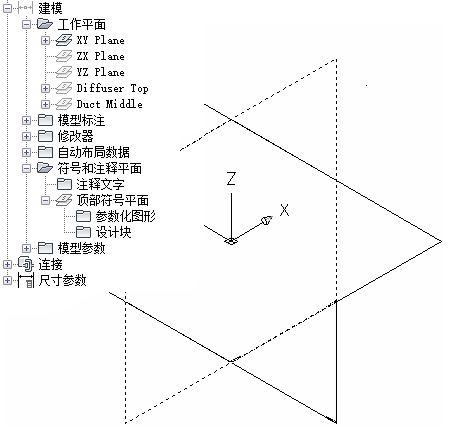 使用以下过程可添加在其上创建模型的几何图形的工作平面。为了避免混乱,除非您使用偏移工作平面或参照工作平面,否则请在工作时仅保持一个工作平面可见。需要其他工作平面来构建模型时,可创建它们。这对于使用偏移工作平面定位零件的多个侧面(如风道末端装置的两个面)很有帮助。使用参照工作平面定位零件上的几何图形(如接线盒的敲孔或水箱上的接头)很有帮助。