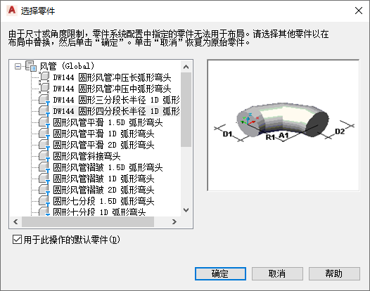 如果尝试在系统配置中未存储的管路中添加或修改零件,则会显示“选择零件”对话框。系统将提示您替换为目录中的其他对象。以下示例显示了在“通用”配置中的“风管系统”域中的对话框: