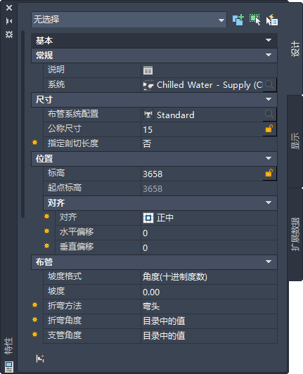 默认情况下,基本特性显示在“管道特性”选项板上。