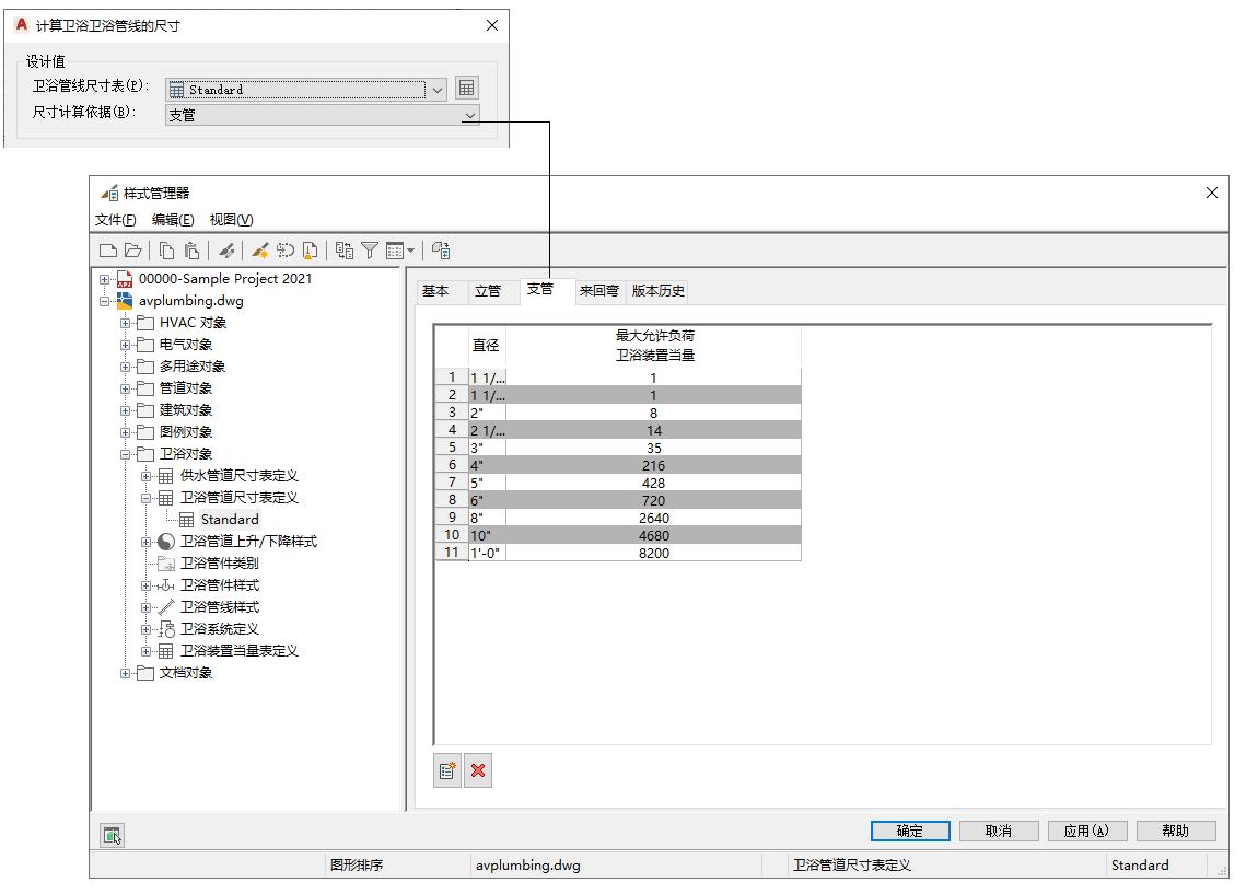 将卫浴管路定义为支管时,软件将使用卫浴管线尺寸表(管道尺寸表)中“支管”选项卡上的信息执行尺寸计算,该尺寸表定义可在“样式管理器”中找到。