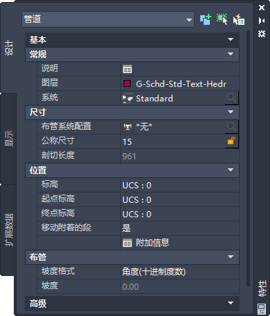 本部分在“特性”选项板的“设计”选项卡上定义用于修改管道系统的特性。“设计”选项卡分成二个部分:基本和高级。
