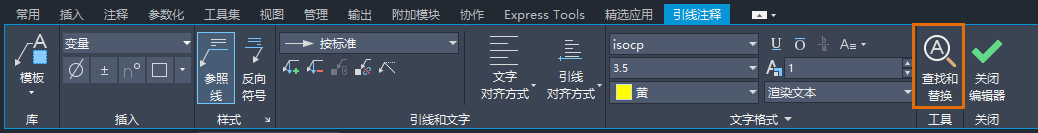 现在,FIND 命令可以搜索和替换 AMNOTE 中的文本,并且“查找和替换”选项已添加到“引线注释”功能区上下文选项卡。