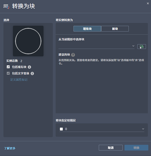 除了将匹配的实例转换为块外,您还可以通过单击“定义属性标记”来指定文字变体的属性标记。