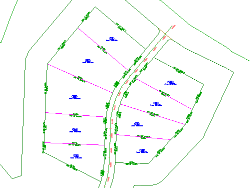 此图形包含一个原地面曲面、若干条表示相交道路中心线的路线和若干条表示特性边界的 AutoCAD 直线与圆弧。在以下的步骤中,您将从现有直线与圆弧创建 Autodesk Civil 3D 地块对象。