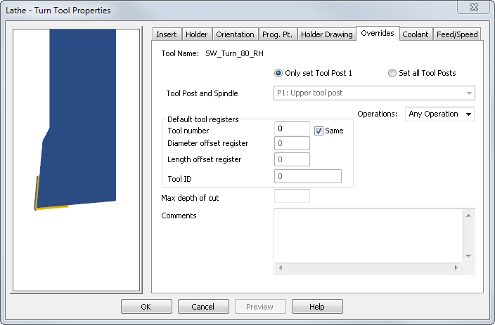 - 刀具编号 - 指定刀具的刀槽编号。输入 0 以允许 FeatureCAM 在使用刀具时指定值。