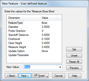 特征类型 - 选择“凸台”、“镗孔”或“盲孔”。