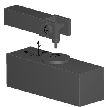 C 旋转工作台和 A 倾斜主轴头 - 这些机床绕 Z 轴旋转,然后主轴头绕 X 轴旋转。