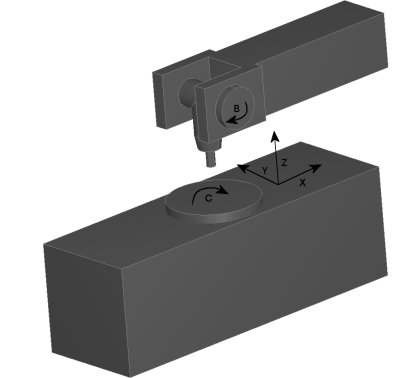 C 旋转工作台和 B 倾斜主轴头 - 这些机床绕 Z 轴旋转,然后主轴头绕 Y 轴旋转。