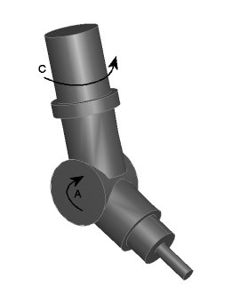C 转动和 A 倾斜主轴头 - 这些机床使用工作台绕 Z 轴旋转,然后主轴头绕 X 轴倾斜。它们也称作万向头。