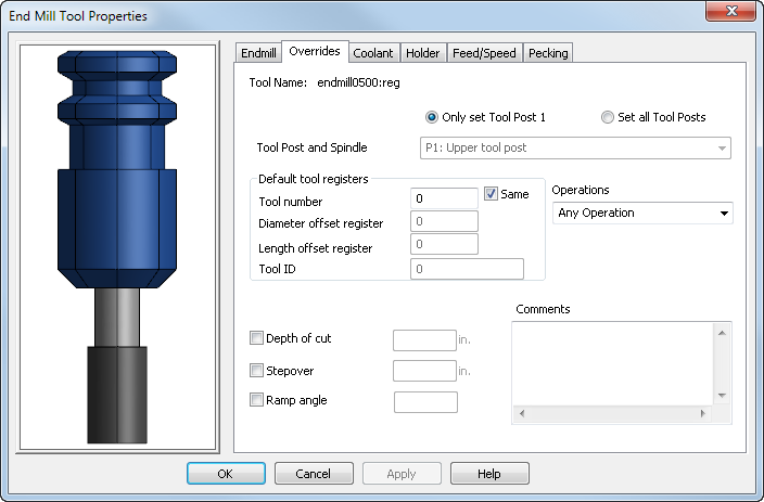 使用“铣刀属性”对话框的“修调”选项卡可设置刀具编号、刀具补偿注册以及选定刀具的偏移注册。