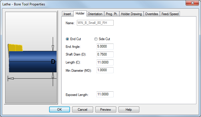 单击刀具预览图像进行平移和缩放。预览的方向由“选项”>“查看”>“机床”页面上的设置确定。在图像上单击鼠标右键可访问关联菜单。