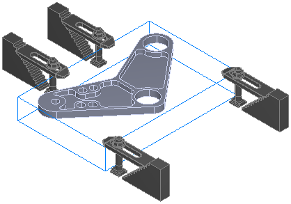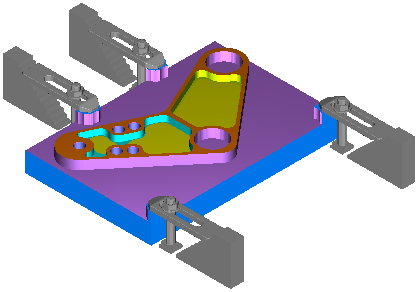 此示例托架零件由四个夹具固定在位:
