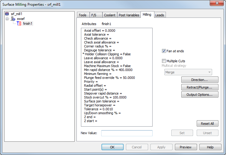 上/下光顺 % - 有时,Swarf 刀具路径必须上移和下移以避免过切。将在您在此处输入的公差内进行光顺。输入刀具直径的百分比。