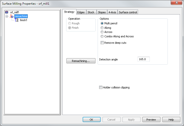夹持碰撞避让 — 避让夹持或刀柄与零件曲面、阻止曲面或未加工毛坯发生碰撞的刀具路径。选择该选项后,在操作的“铣削”选项卡上将显示“夹持间隙”和“刀柄间隙”属性。