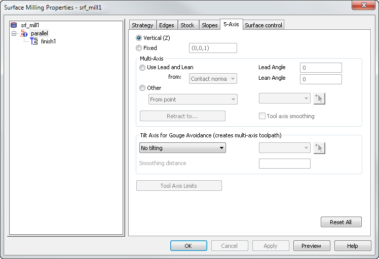 可以使用“曲面铣削属性”对话框的“5 轴”选项卡编辑曲面铣削特征的“多轴”选项。