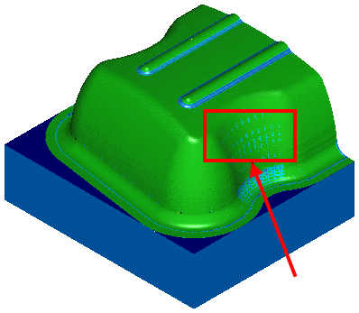零件比较是指将刀具路径切削的零件与零件的实际曲面(称为“目标零件”)进行比较。目标零件将被三角形近似表示,以用于比较。如果该公差太大,则零件比较会报告过切或残留材料(而实际上在该位置没有这种情况)并且模型包含条纹,例如: