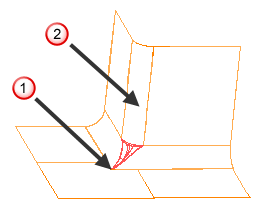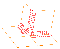 - 如果提供了第四个曲面,它通常不是圆倒角曲面。对于这些曲面,必须在第四个曲面上提供一条曲线。提供的曲线必须位于第四个曲面上,并且应该与轨道曲线或相邻圆倒角相切。