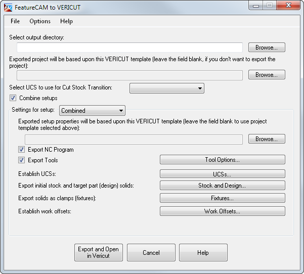 使用“FeatureCAM 到 VERICUT”对话框可指定用于将铣削或车/铣文档输出为 Vericut 项目的选项: