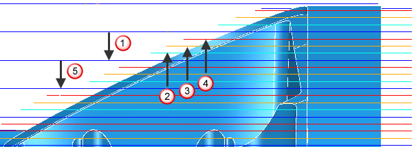 主等高切面照常自上而下切削。中间等高切面则自下而上切削。可以做到这一点,因为其切削深度始终小于主等高切面的切削深度(或下刀步距)。这是切削零件最高效的方法,因为此方法会减少路径数,并增加每个路径的切削深度。