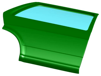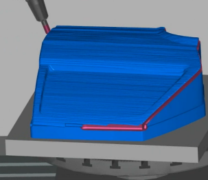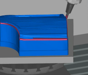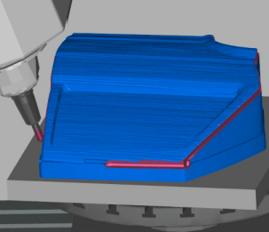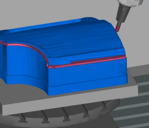 在模型的某些区域中,无法避免旋转,例如刀具在拐角和轮罩拱周围移动时。但是,机床工作台会前后摆动,例如在车门的这条长边上的区域,可以使用“曲面上阶梯”选项来避免该摆动: