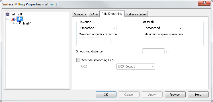 您可以使用“曲面铣削属性”对话框的“轴光顺”选项卡在曲面铣削刀具路径上指定轴光顺。