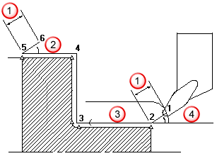“进刀角度”和“退刀角度”通过路径(或路径的延长部分)进行指定,与刀具所在的路径侧以及刀具行进的方向有关。在下图中,点 1 是计算的进刀点,点 6 是计算的退刀点。