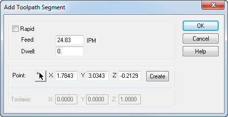 此对话框使您可以插入新点,然后再开始当前选定的点。对于每个要创建的点,输入新的点坐标,指定进给率或选择“快进”选项,(可选)输入“停留”(以秒为单位),然后单击“创建”按钮。当您完成了创建点,请单击“确定”。
