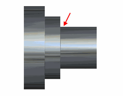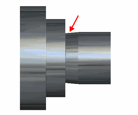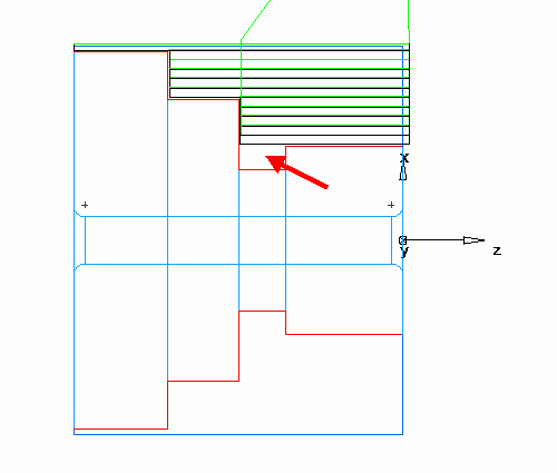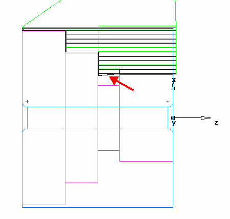 在以下示例中,切削车削特征的刀具已开始下降到槽特征。在标记区域的中心线仿真中您可以看到此情况: