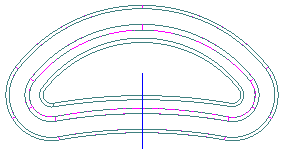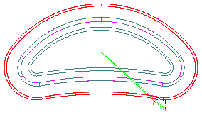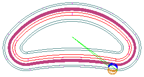 若要修调默认开始点,必须创建在新开始点位置处与刀具路径相交的曲线。在以下示例中,该曲线显示为蓝色: