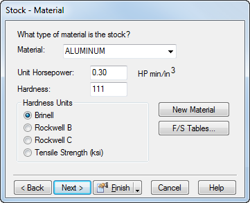“单位马力”或“指定切削力” - 会针对已选材料显示默认值,也可以为材料输入新值。