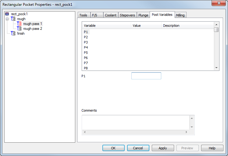 此选项卡包含变量的列表。可以为每个变量输入“值”,以便在后处理中使用变量的名称时,会将指定的值输出到 NC 代码。