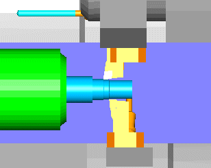 进行粗加工时,通常执行随动车削。每个刀架会移除标准的切削深度。第二个刀架会在第一个刀架留下的切削下方移除切削深度。刀架会在切削开始处等待或同步。刀架 1 位于刀架 2 前面的固定距离处。下图显示了随动车削。顶部刀具在底部刀具的前面,底部刀具在 X 轴上切削的深度更深。