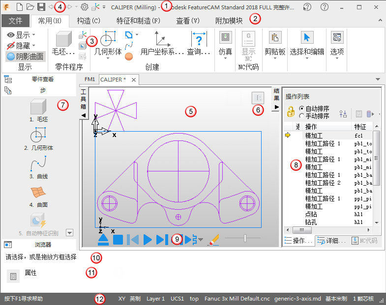 FeatureCAM界面包含许多传统的Windows元素,例如功能区菜单、对话框、上下文菜单和向导。