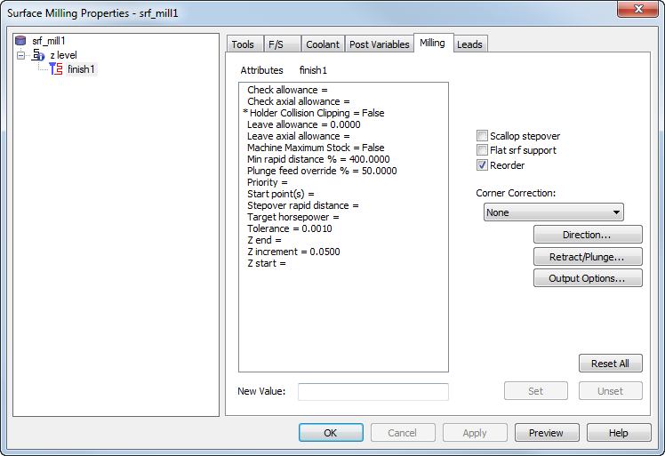 公差 - 该属性用于控制刀具路径跟随曲面的精确程度。如果零件显示为有镶嵌面,请将公差设置为较小的值。