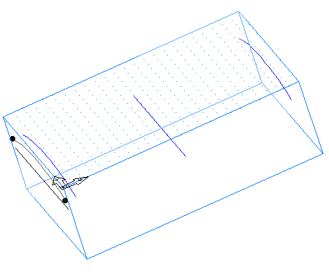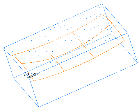 下面的肥皂盒模型使用了一个放样曲面。有必要了解一下它的源曲线。使用毛坯侧边上的用户坐标系(如图中所示),按 Z 方向上的深度(相对于设置)绘制了一个简单的几何形体。该几何形体随后在 X 方向上变换,以设置肥皂盒电极的顶部曲面的开始、中间和结束曲线。这些曲线随后用于构建放样曲面。该几何形体可能必须反向,才能获得正确的曲面。